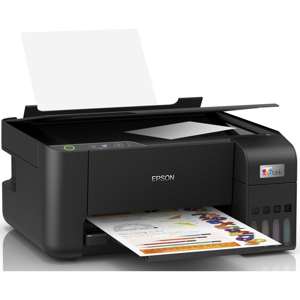 Багатофункціональний пристрій EPSON EcoTank L3230 Кольоровий друк Презентація пристрою в розгорнутому вигляді спереду на білому фоні під кутом Роздільна здатність сканування 600 x 1200 DPI Час сканування A4 Плавна робота