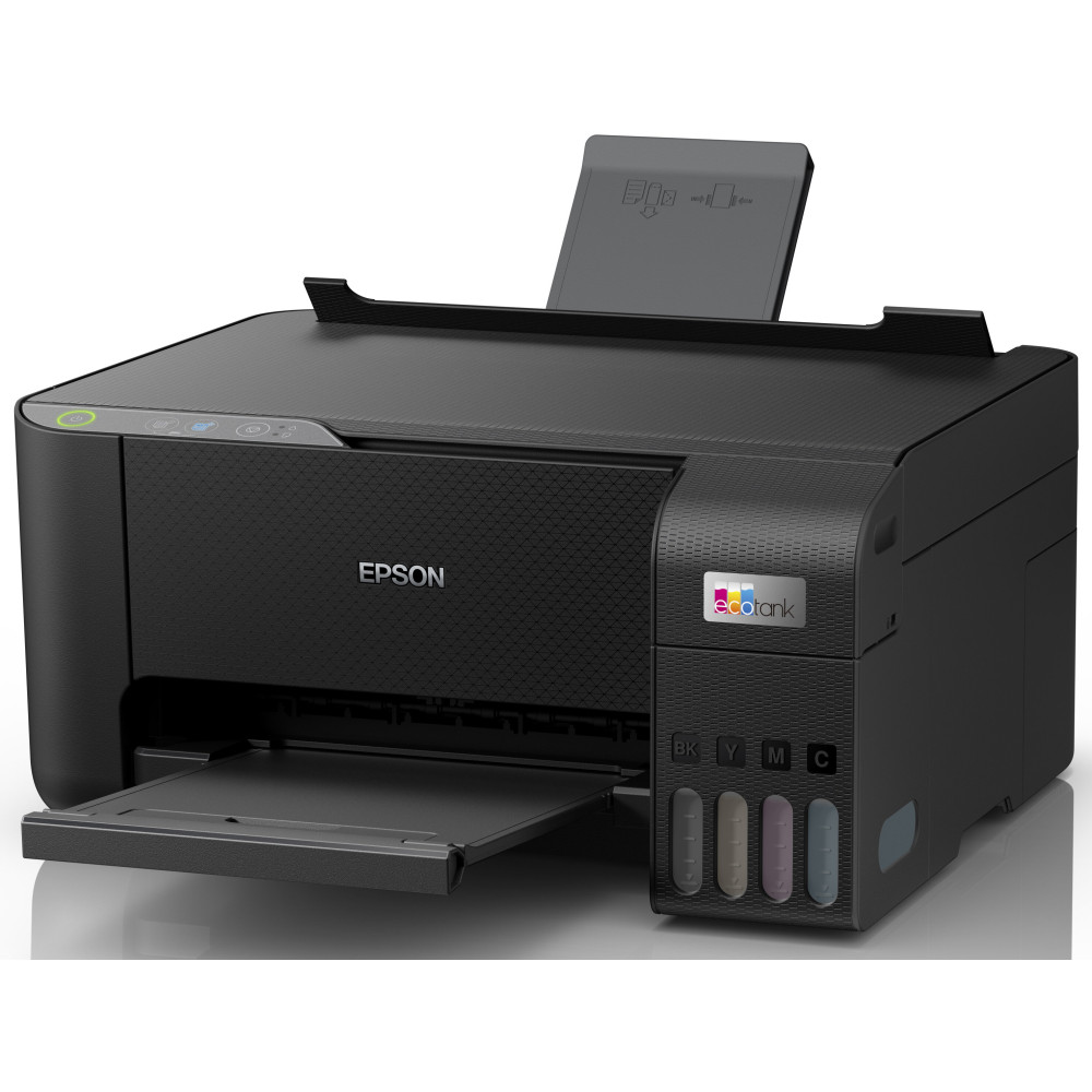 Багатофункціональний пристрій EPSON EcoTank L3230, кольоровий друк, розгорнуте спереду зображення пристрою на світлому фоні, кутовий підхід, просте керування та використання
